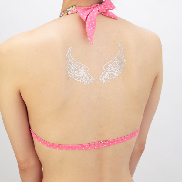 背中にシルバーの羽を持つ美しいエンジェルに!簡単貼り付けタイプのタトゥーシール「天使の羽・銀」。