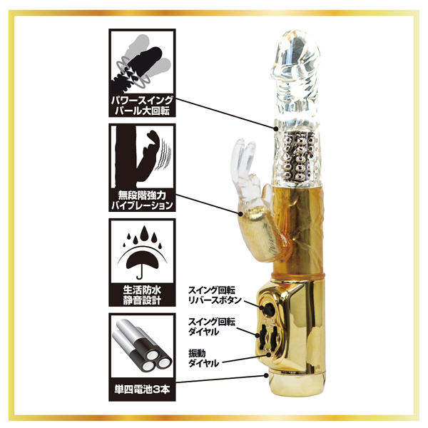 高級感のある見た目と強力スウィング&振動に圧倒される!クリスタル×ゴールドの子機付きバイブ。